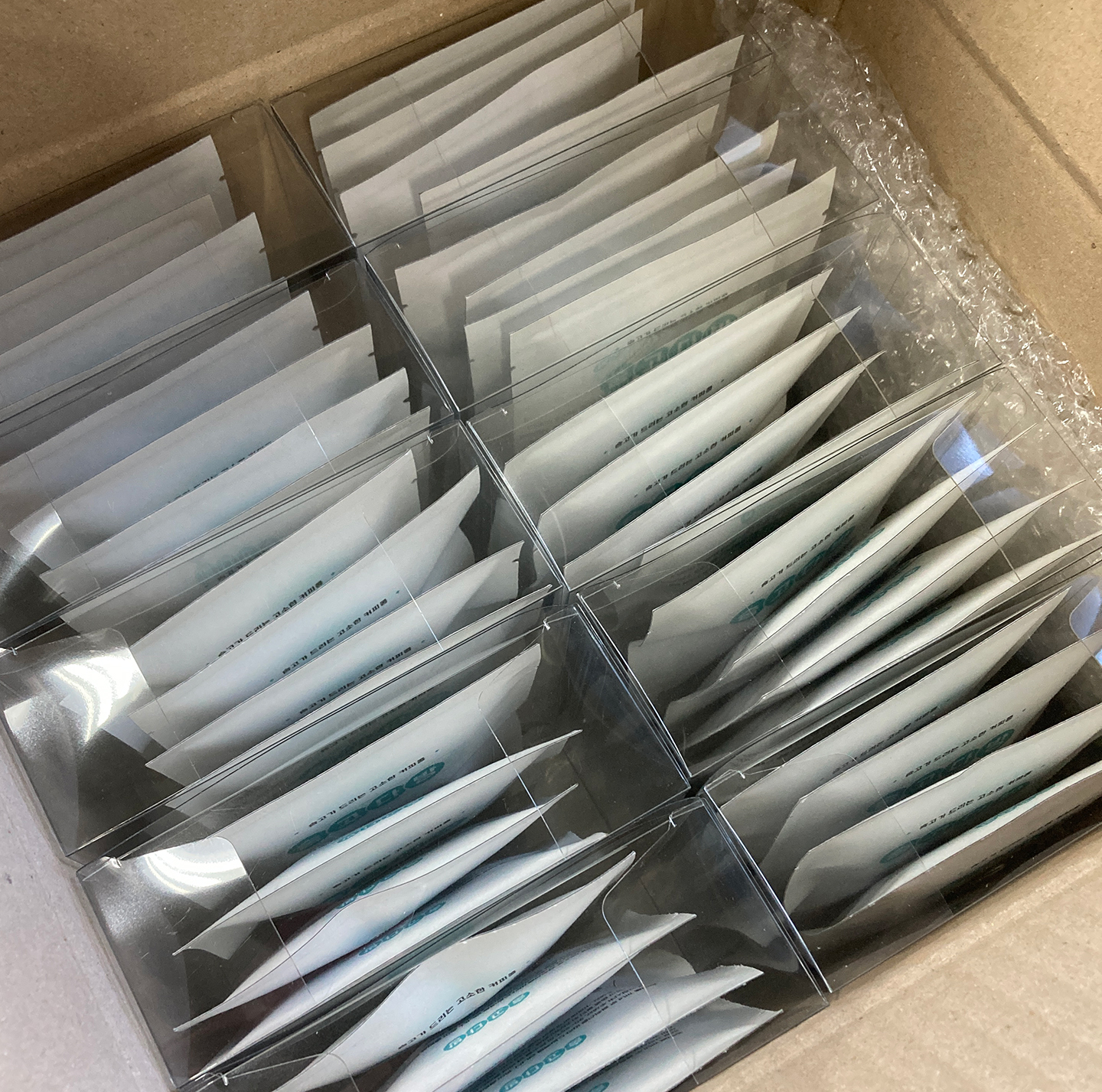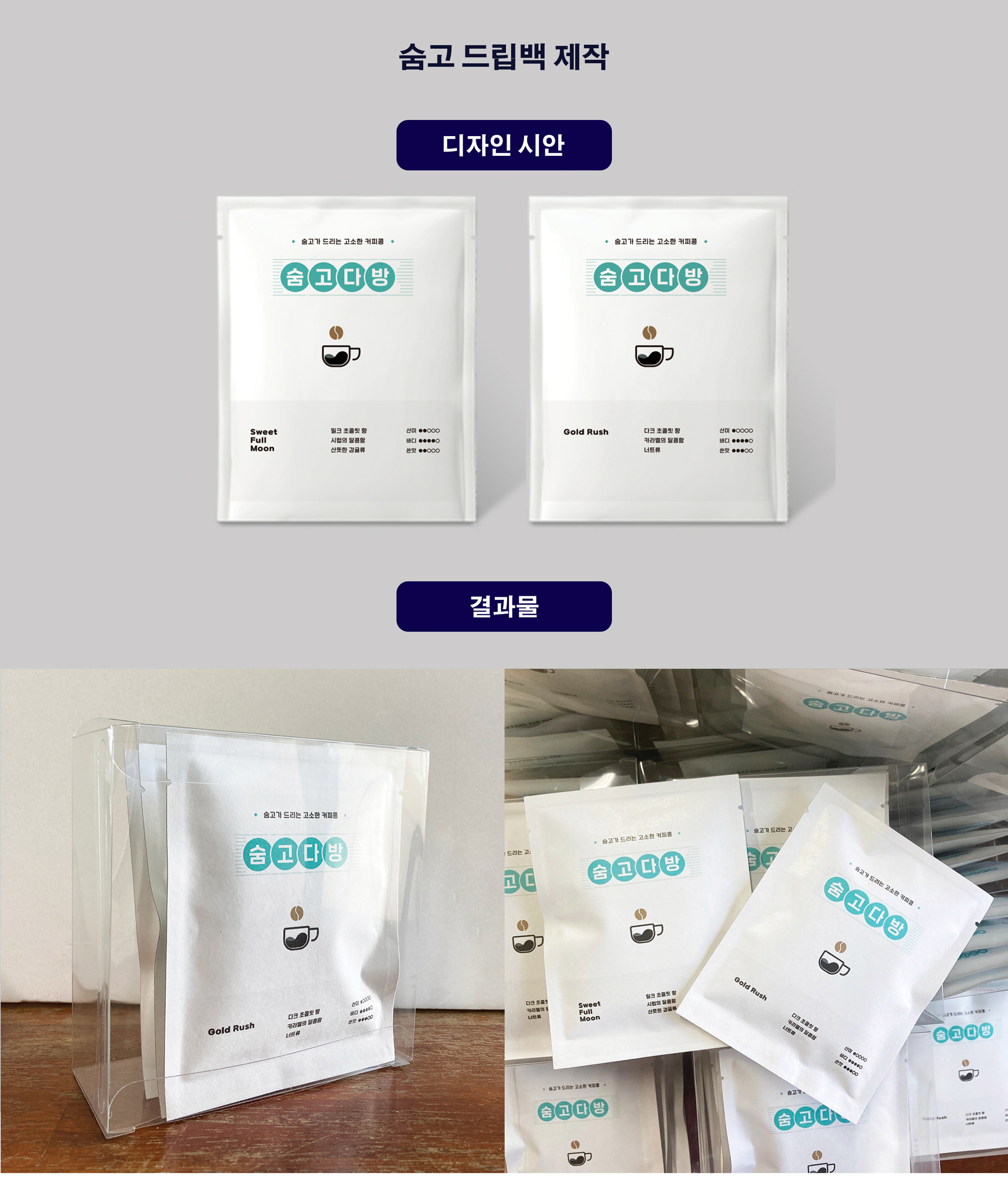 포장지가 인쇄소에서 도착하자 마자 드립백 포장지에 넣어 완성품을 만들었습니다.